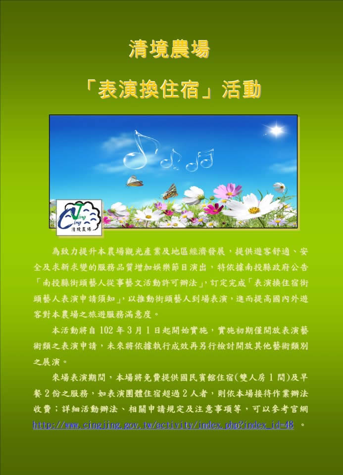 【清境農場報導】清境農場為提升觀光產業及地區經濟發展,提供遊客舒適安全、求新求變的服務品質並增加娛樂節目演出,完成「表演換住宿街頭藝人表演申請須知」,以推動街頭藝人到場表演,進而提高國內外遊客對清境農場之旅遊服務滿意度。請具申請資格的民眾踴躍參加,期待大家的參與。 詳細活動辦法及申請規定等,請下載:清境農場「表演換住宿」街頭藝人表演申請須知。